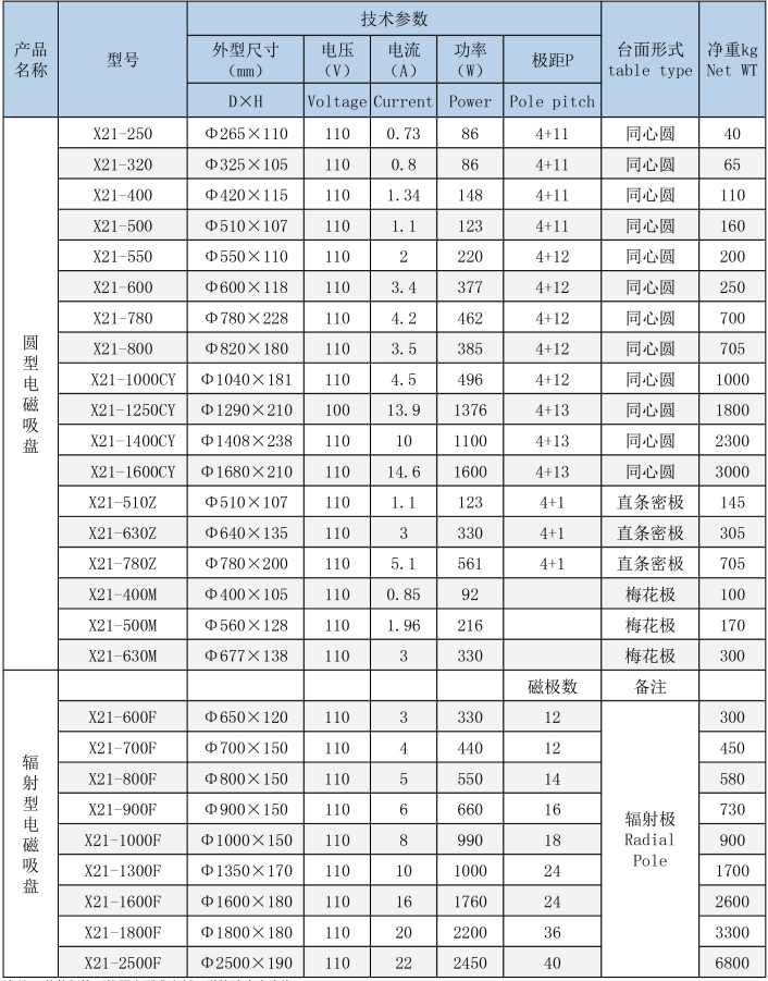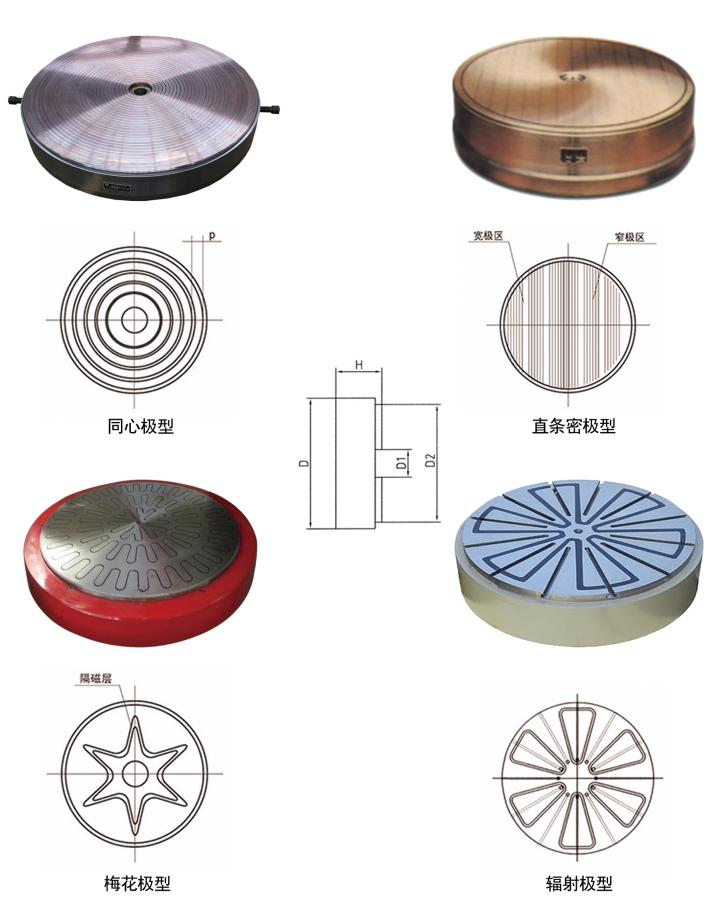 圓形電磁吸盤分為:同心圓型、直條密極型、梅花極型、放射極型。