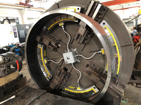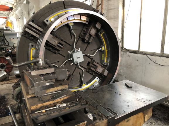 1.6m臥式車床加工圈類零件,采用組合式電永磁吸盤,取代了卡盤;